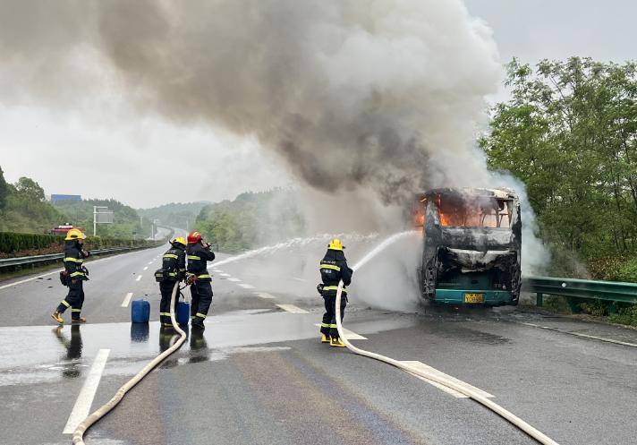 司机符志国,是一名消防退伍兵,当他从后视镜中看到大巴发动机部位起了明火,立刻将大巴车停在了应急车道后,打开车门,边安抚大家情绪边组织大家有序、迅速下车远离现场,到高速公路路边外安全地带等候救援,大声、急促提醒大家:保命为先!越快越好!行李先不管!离得越远越好!车辆随时有可能爆炸!不要好奇、看热闹而滞留在高速公路内,以免爆炸、车祸引起二次伤害!同时拨打119报警求救。 接警后,消防员迅速出动。现场浓烟滚滚,火舌已将整辆车吞没,时不时传来玻璃炸裂的声音。消防员迅速铺设两条水带,装好2支喷射枪灭火。半小时后,大火扑灭。