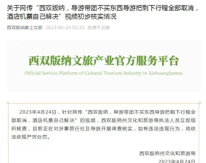 2023年4月24日,针对近日在网络上疯传的一段视频,西双版纳州文化和旅游局执法人员迅速展开调查核实。据视频内容显示,一名导游因为旅行团中有游客不愿意购买当地特产,导致该导游取消了该团剩余的行程,让游客们自行解决酒店和机票问题。此事一经曝光,立即引起了社会广泛关注和谴责。