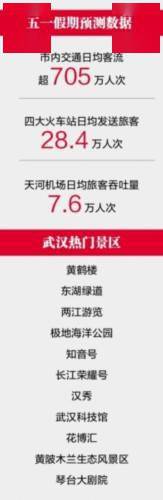 根据中国铁路公众号发布的五一期间全国车票发布情况,4月28日—29日是五一假期出行高峰,武汉名列主要到达城市前十,入围“五一假期热门城市”。在携程、飞猪等平台发布的五一假期TOP10高铁旅游目的地中,武汉均名列其中。携程数据表明,五一期间,武汉最热门的景区是黄鹤楼、两江游览、极地海洋公园、知音号等。驴妈妈的数据显示,今年五一,以主题乐园为目的地的亲子游产品预订人气高涨,其中武汉欢乐谷最受青睐。
