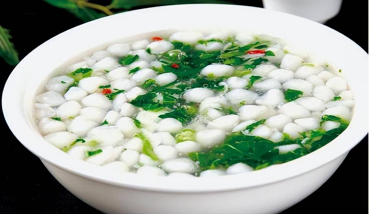 5、漂汤鱼丸,是济宁微山当地的渔家菜代表作之一,也是济宁的一道传统名吃。漂汤鱼丸呈现乳白色,和白果一般大小,特点就是不会沉在汤中,而是全部在汤上漂浮着,撒上蒜苗、香菜,闻着清香扑鼻,吃着软嫩鲜香,不腻口,非常好消化吸收。