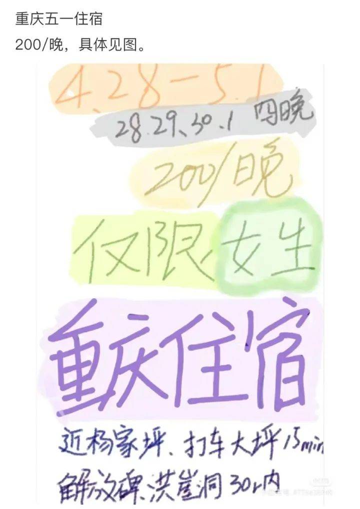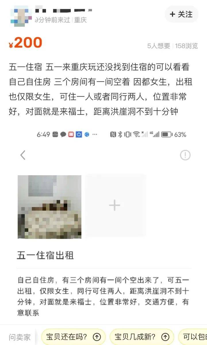 一名在北京读书的网友表示,自己在重庆有一套两室一厅的房子,距离解放碑四五公里,已经半年没住人了,查了查五一好像很难定到酒店,就挂出来,价格在300元/晚,目前均已订出,“解放碑的如家都涨到七百一晚了,南岸区三百元以下根本没房。今年好可怕,还是在家待着吧。”