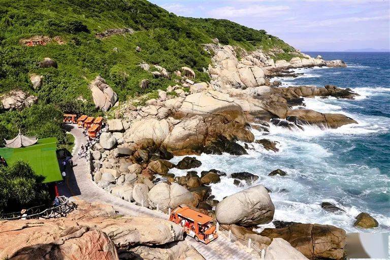 ▲游客在蜈支洲岛旅游区乘坐景区观光车环岛游。三亚日报记者 陈聪聪 摄