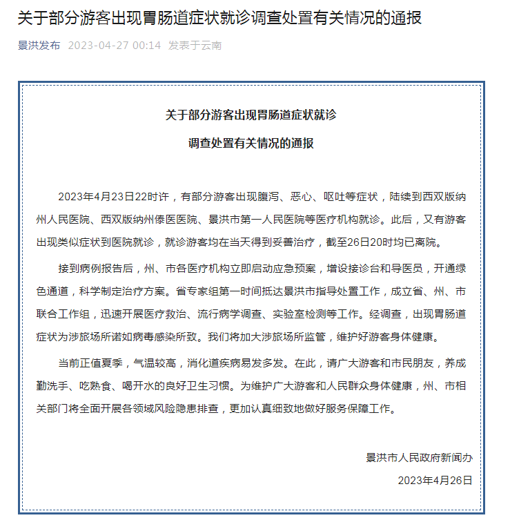 《通报》称,2023年4月23日22时许,有部分游客出现腹泻、恶心、呕吐等症状,陆续到西双版纳州人民医院、西双版纳州傣医医院、景洪市第一人民医院等医疗机构就诊。此后,又有游客出现类似症状到医院就诊,就诊游客均在当天得到妥善治疗,截至26日20时均已离院。