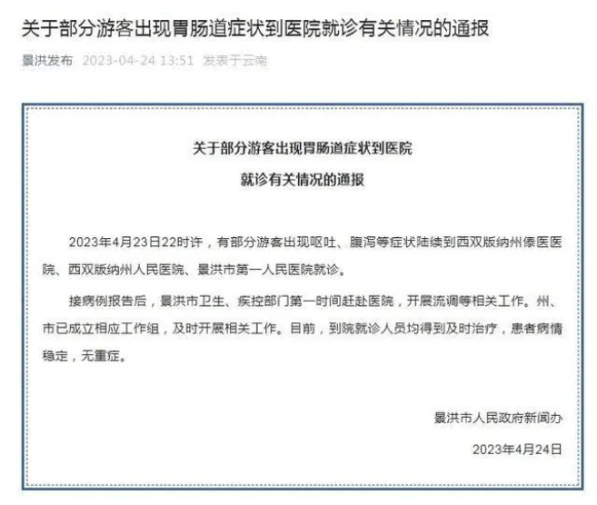 4月24日,云南景洪市政府新闻办发布《关于部分游客出现胃肠道症状到医院就诊有关情况的通报》称,23日22时许有部分游客出现呕吐、腹泻等症状陆续到医院就诊。