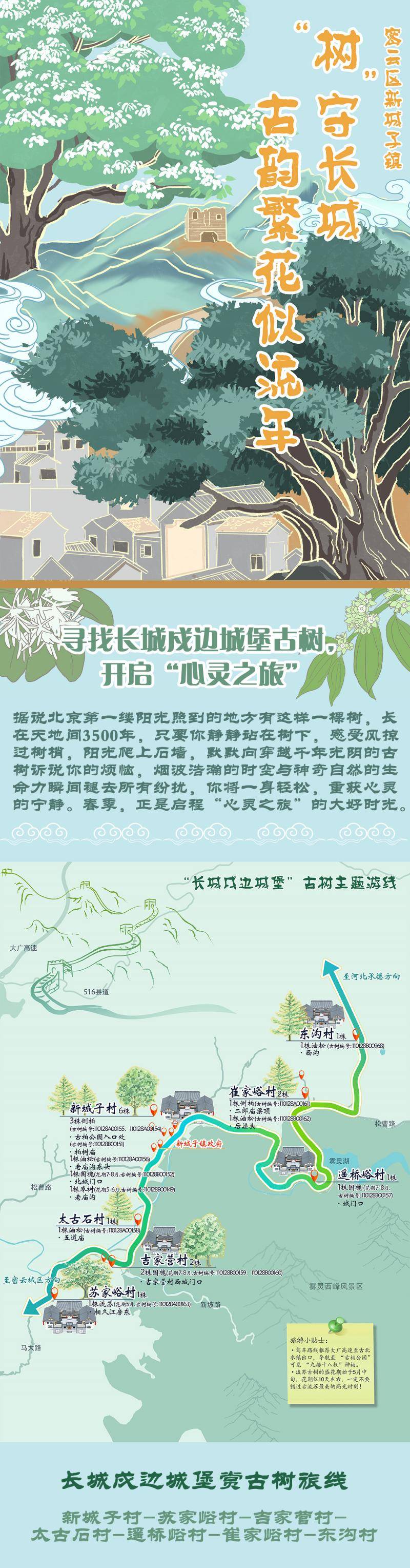 沿着“长城戍边城堡”古树游线,市民游客可以来到“京城第一缕阳光照到的地方”——密云区新城子镇,那里有树龄3500年的“九搂十八杈”古柏、花开时覆霜盖雪的古流苏,以及10余株见证密云戍边历史的古树。