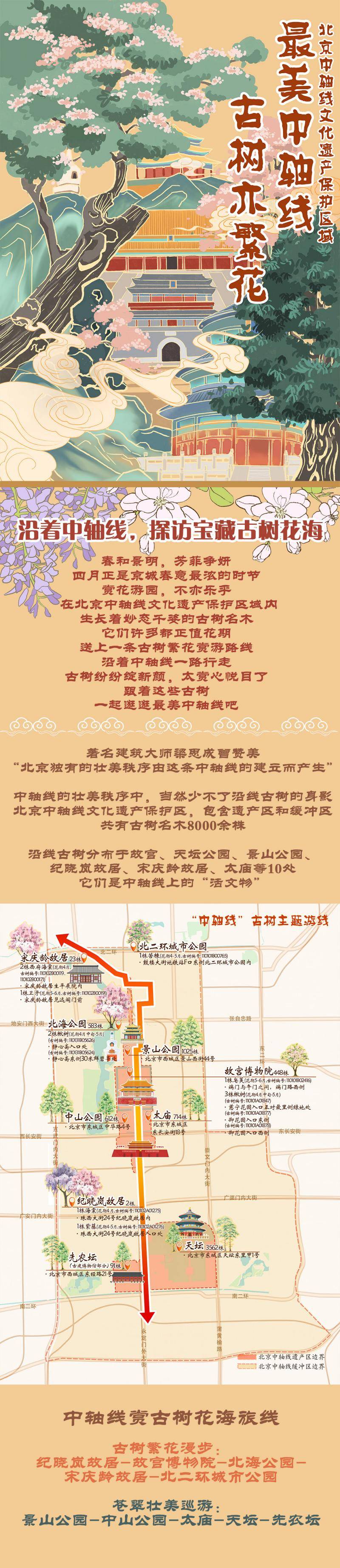 沿着“中轴线”古树游线,市民游客可以打卡紫禁城内貌美古楸树、海棠、紫藤、皂荚等壮美古树,沿途逛一逛故宫、北海、纪晓岚故居、中轴线文化遗产点等景点,用脚步丈量建筑大师梁思成先生所说的由中轴线组成的北京城“独有的壮美秩序”。