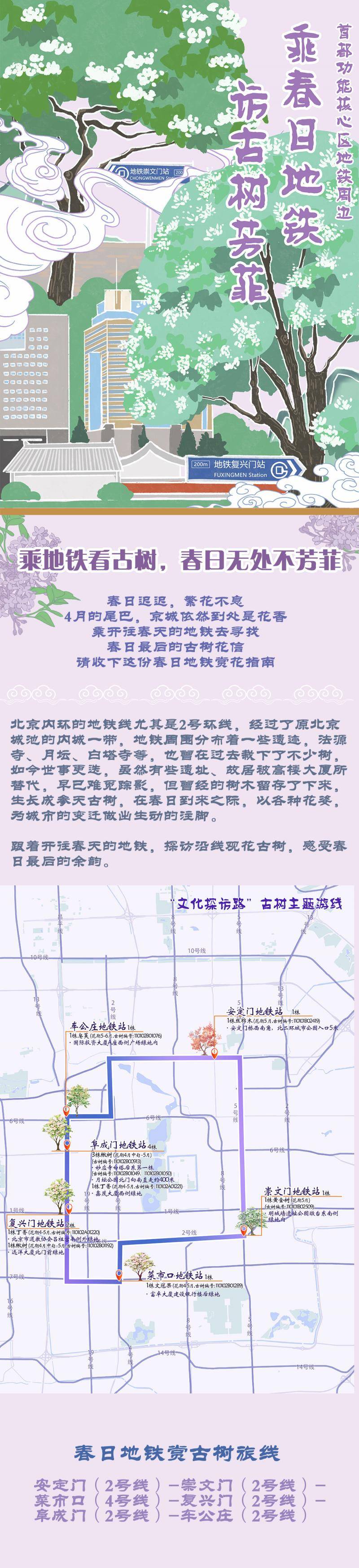 “文化探访路”古树游线为市民游客推荐了可搭乘地铁赏开花古树的线路,在地铁沿线的公园、古寺、街头绿地和商业大厦旁,寻找文冠果、丝棉木、黄金树等这些在世事更迭中仍然生机勃勃的春日古树。