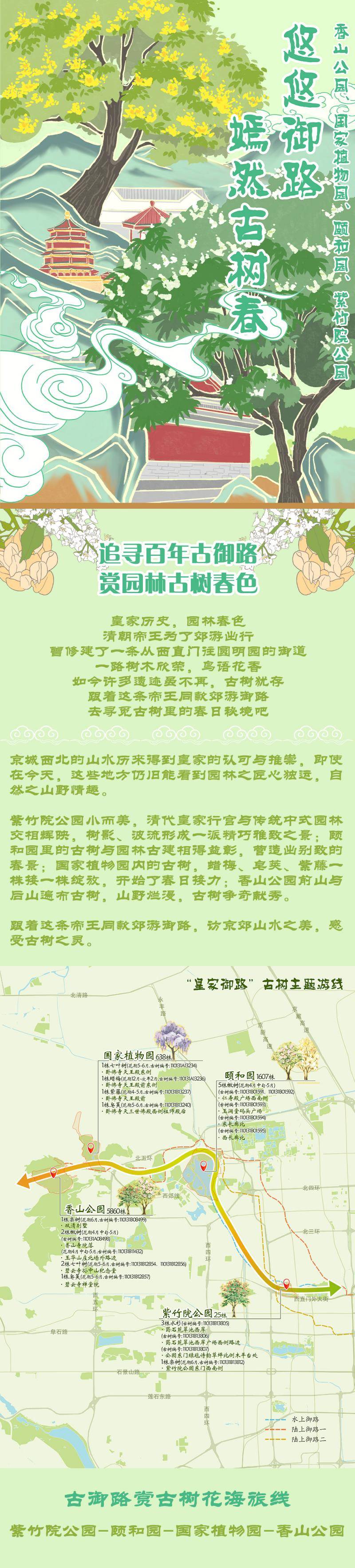 “皇家御路”古树游线,从紫竹院公园向北沿着清代古御路走进颐和园、香山公园、国家植物园,探访京郊山水之美,不但可以观赏到七叶树、栾树、楸树等著名古树,还可感受皇家园林的古树灵韵与匠心独韵。
