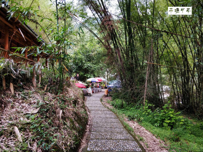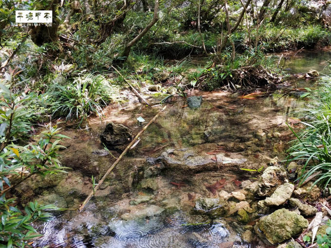 甲茶瀑布流下来的水,很快就汇入另一河道。那是从燕子洞方向下来的水。因河道曲折,被称为九曲十八弯。