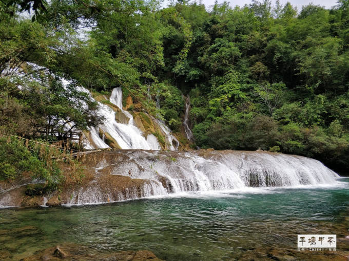 瀑布沿陡坡撒落下来,落入碧云潭,然后又漫过凹凸不平的石灰岩,再落下,形成美丽的珠帘。