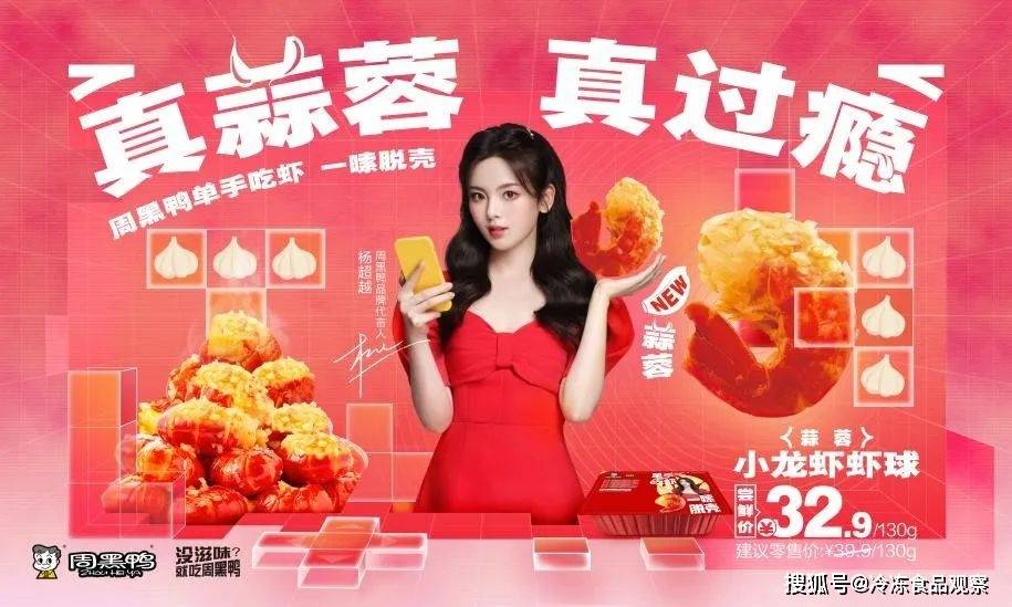 2022年,周黑鸭聚焦年轻消费主力,挖掘消费者“吃虾怕麻烦”的痛点,主打“单手吃虾”,成功推出大单品——小龙虾虾球,并官宣杨超越为品牌代言人。这种新吃法,让消费者在尽享舌尖好滋味的同时,也不耽误畅玩手机的乐趣,完美贴合郊游聚会、夜间剧场等休闲场景。