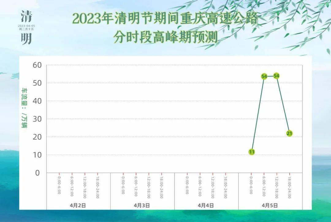 重庆高速集团介绍,综合分析,预计2023年清明节期间全路网车流量约140万辆次,较平日增长约56%。预计出入境日均车流量约16.3万辆次,其中入境日均车流量约8.0万辆次,出境日均车流量约8.3万辆次。