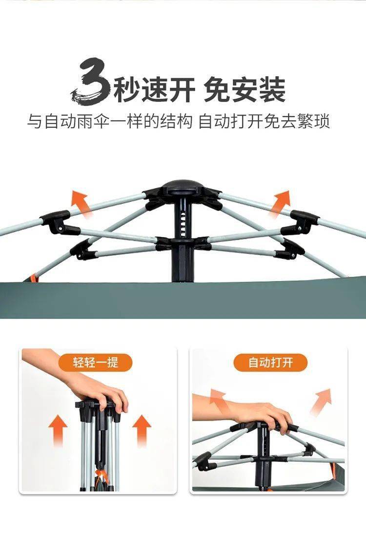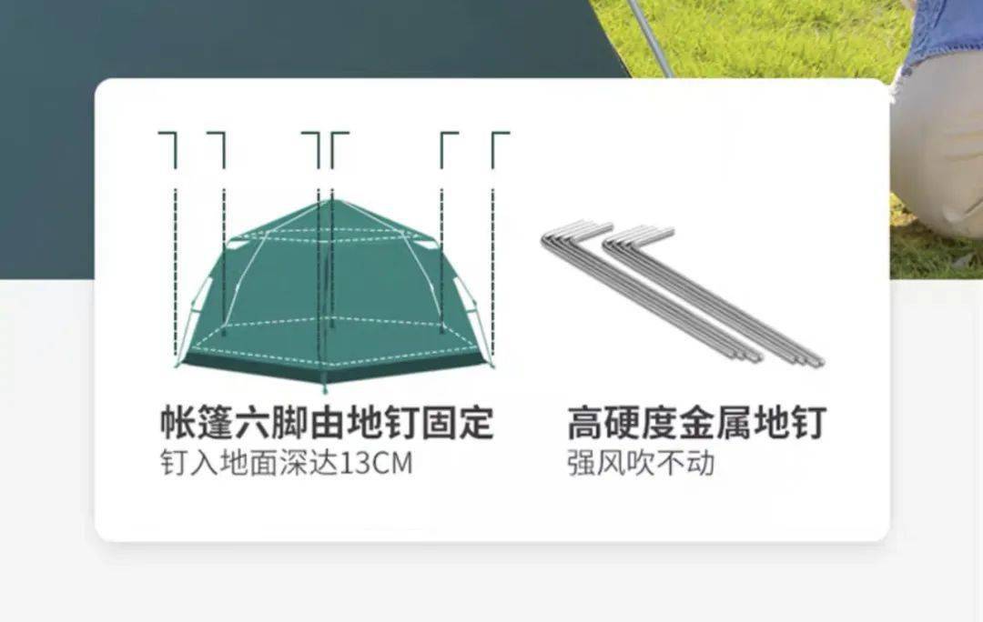 此外,还配有五面高密度网纱,通风防蚊虫的同时不闷热;六脚由高硬度金属地钉固定,钉入地面13cm,抗5级风,非恶劣天气都能满足消费者的基本需求。