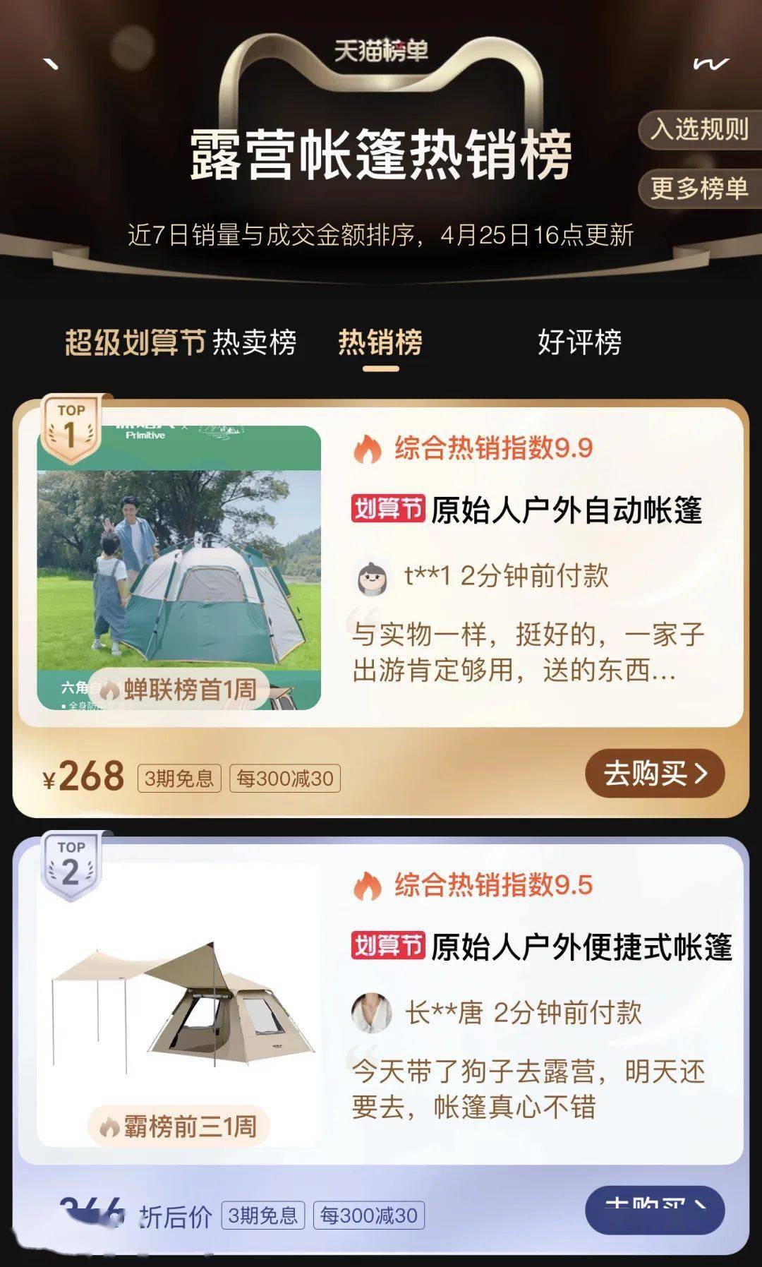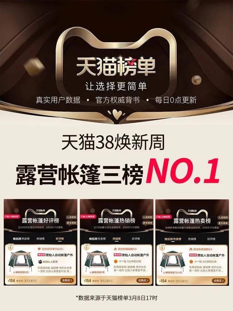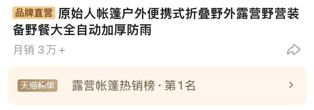 原始人以三招必杀技打造出户外自动帐篷,并将其背后的爆品逻辑成功复制,不断打造爆品。旗下户外便捷式帐篷紧随其后,荣登天猫露营帐篷热销榜榜二,两款产品同时上榜。