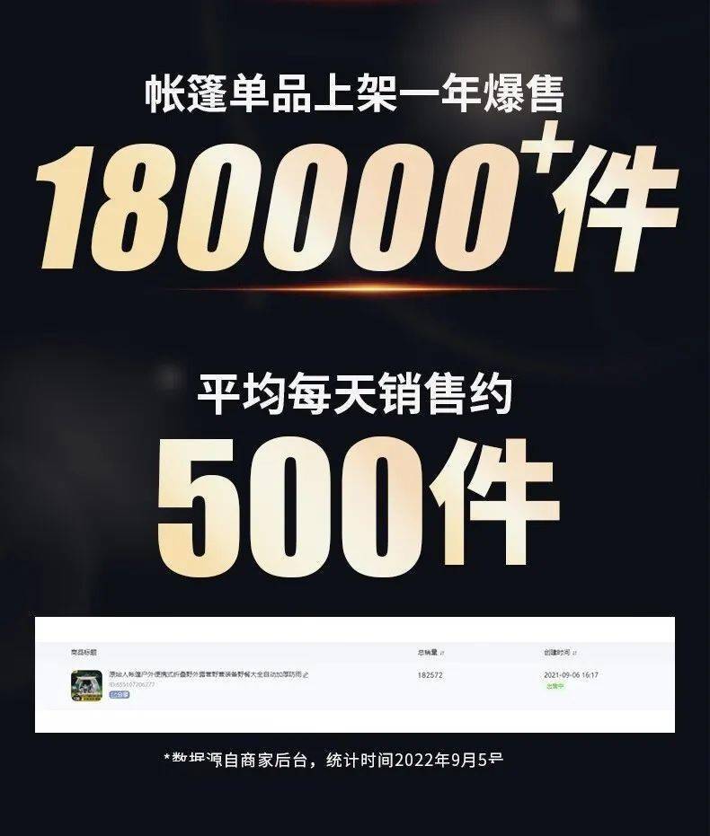 原始人户外自动帐篷单品上架一年爆售180000+件,平均每天销售约500件。肉眼可见的火热程度。