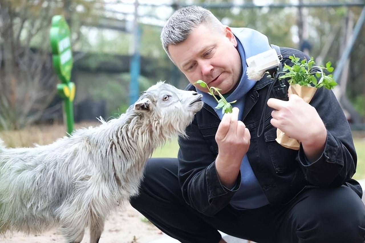 俄罗斯博主斯拉瓦在晋源区稻田公园参访稻田游乐项目,投喂萌宠羊
