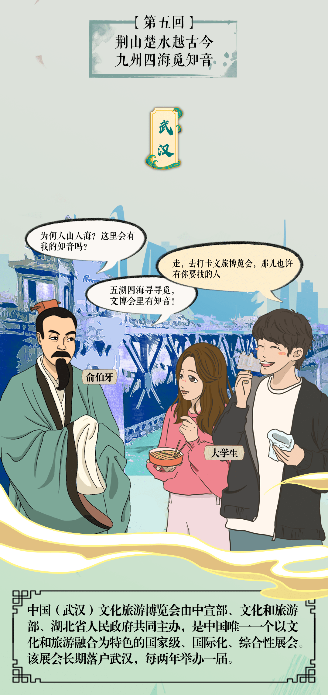 荆山楚水孕古育今,璀璨文化历久弥新。伯牙穿越百万年荆楚历史所寻觅的知音,正是这届中国(武汉)文化旅游博览会所要传达的思想——以开放姿态迎八方客,在九州四海寻觅读懂一座城的“知音”。