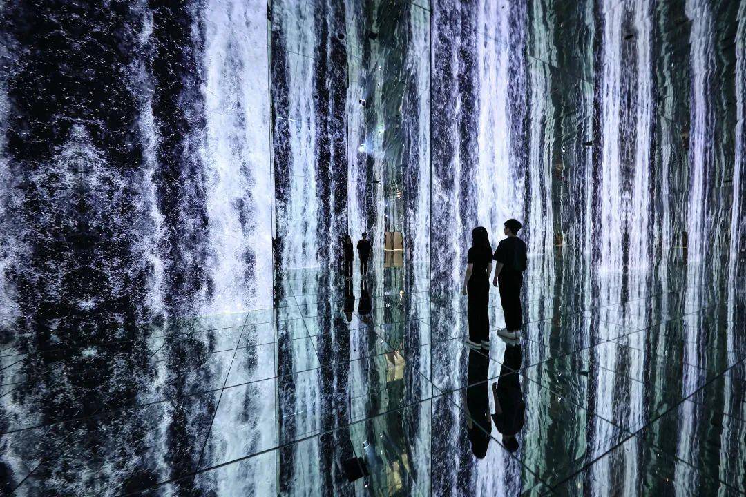 提到瀑布,在不少人的固有认知中,瀑布可能总与山石相伴。《无极瀑布》一反常态,为观众带来由数字媒体技术创造出的壮观瀑布,带来极致的超现实体验。瀑布从高空倾斜而下,在镜面打造的六面空间中无限延伸,观众在此可见证身处超现实空间中脱离地心引力的震撼奇观。