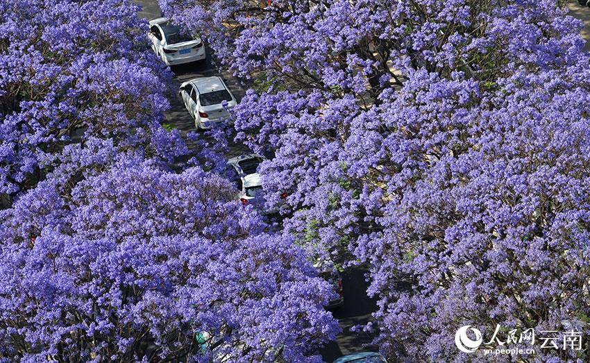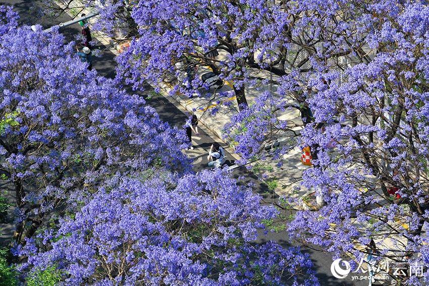 人民网昆明4月27日电 (蔡树菁)近段时间,云南省昆明市街头的蓝花楹悄然绽放。一团团、一簇簇,街道被如梦似幻的紫色花海包裹,抬头看,天空也仿若弥漫着紫色云雾。这城市专属的限定版浪漫,吸引大量市民游客前往拍照游玩。
