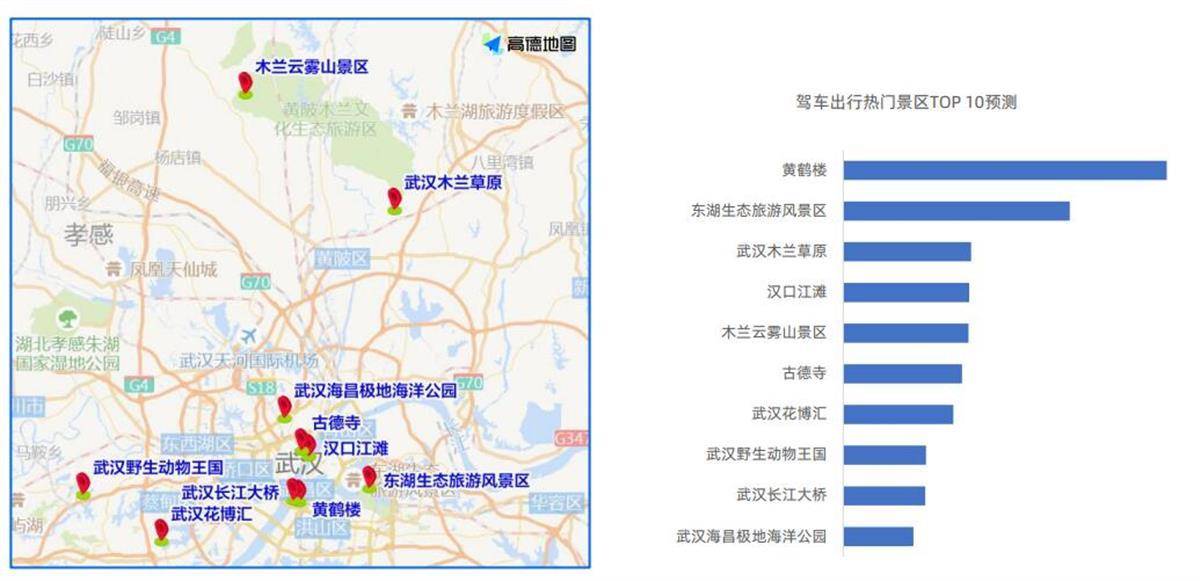 高德地图根据历史大数据分析,武汉驾车出行热门景区TOP10依次为:黄鹤楼、东湖生态旅游风景区、武汉木兰草原、汉口江滩、木兰云雾山景区、古德寺、武汉花博汇、武汉野生动物王国、武汉长江大桥、武汉海昌极地海洋公园。