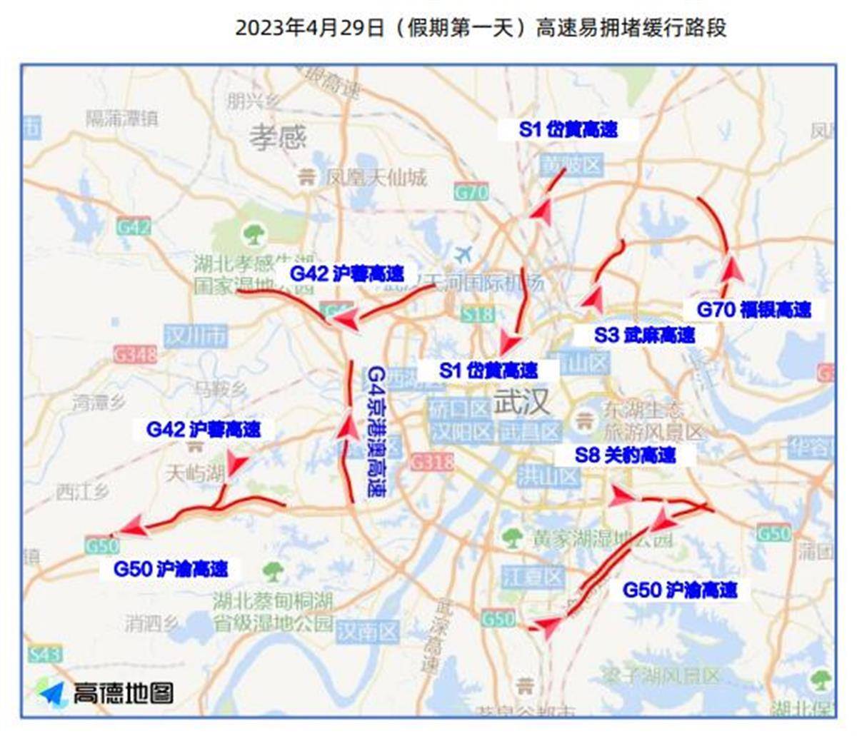 高德地图交通大数据预测 ,“五一”期间,武汉市出程易拥堵缓行的高速主要是G50沪渝高速、S1岱黄高速、S15汉蔡高速的部分路段;建议行驶到以下路段的驾驶员时刻注意路况,及时躲避拥堵。