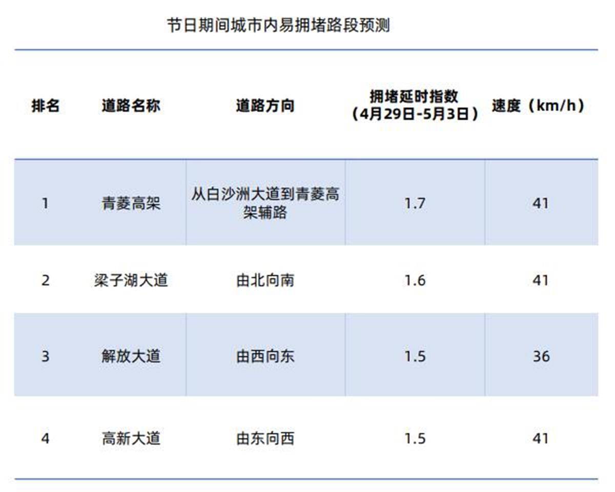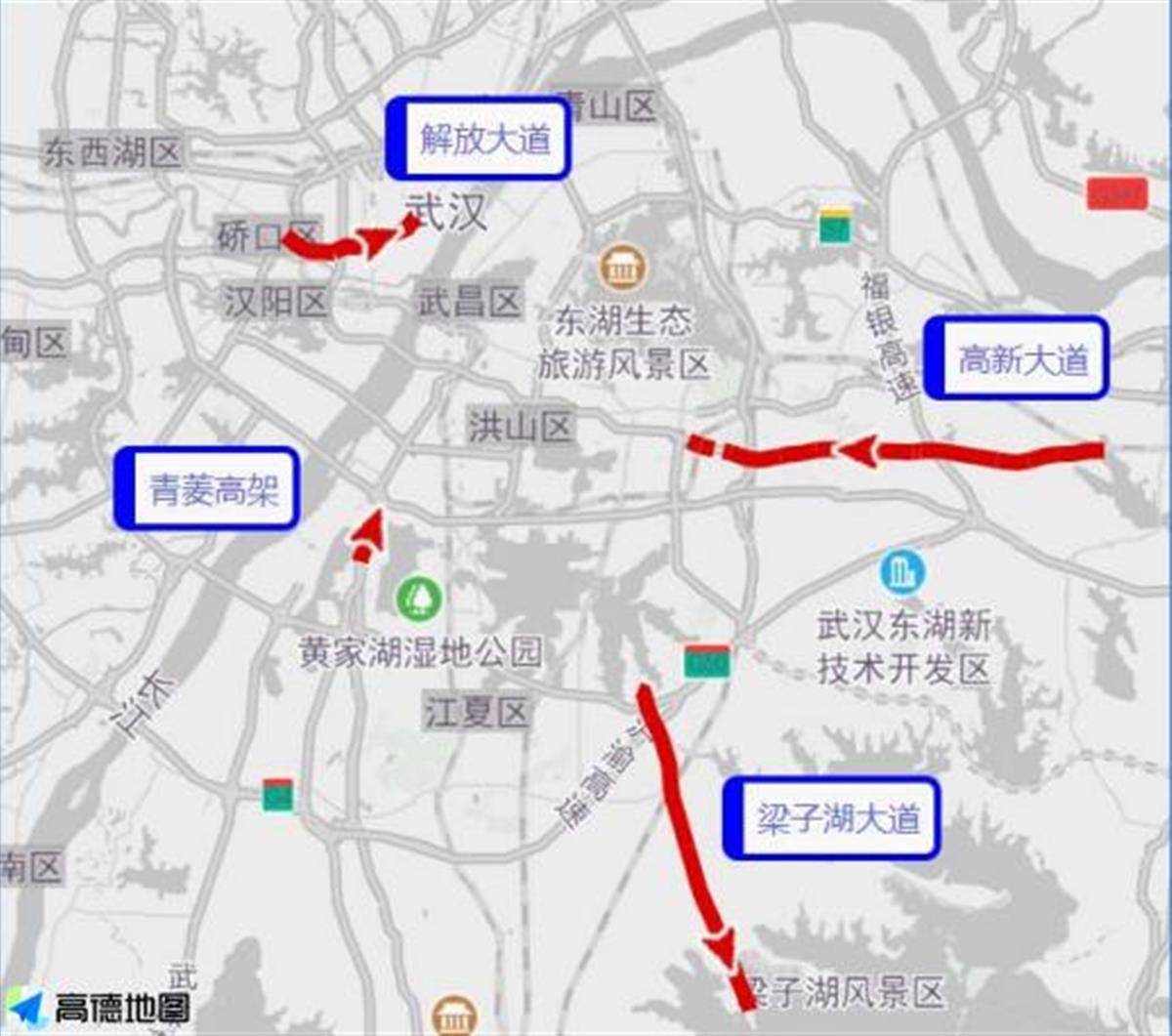 预计节日期间市区易发生拥堵缓行的路段有青菱高架、梁子湖大道、解放大道、高新大道等。