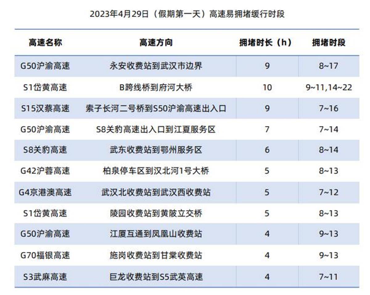 预计2023年4月29日(假期第一天)8时—12时为高速公路出程拥堵高峰;返程较为分散,无明显拥堵高峰。
