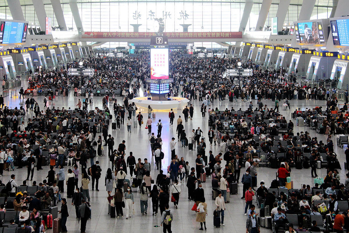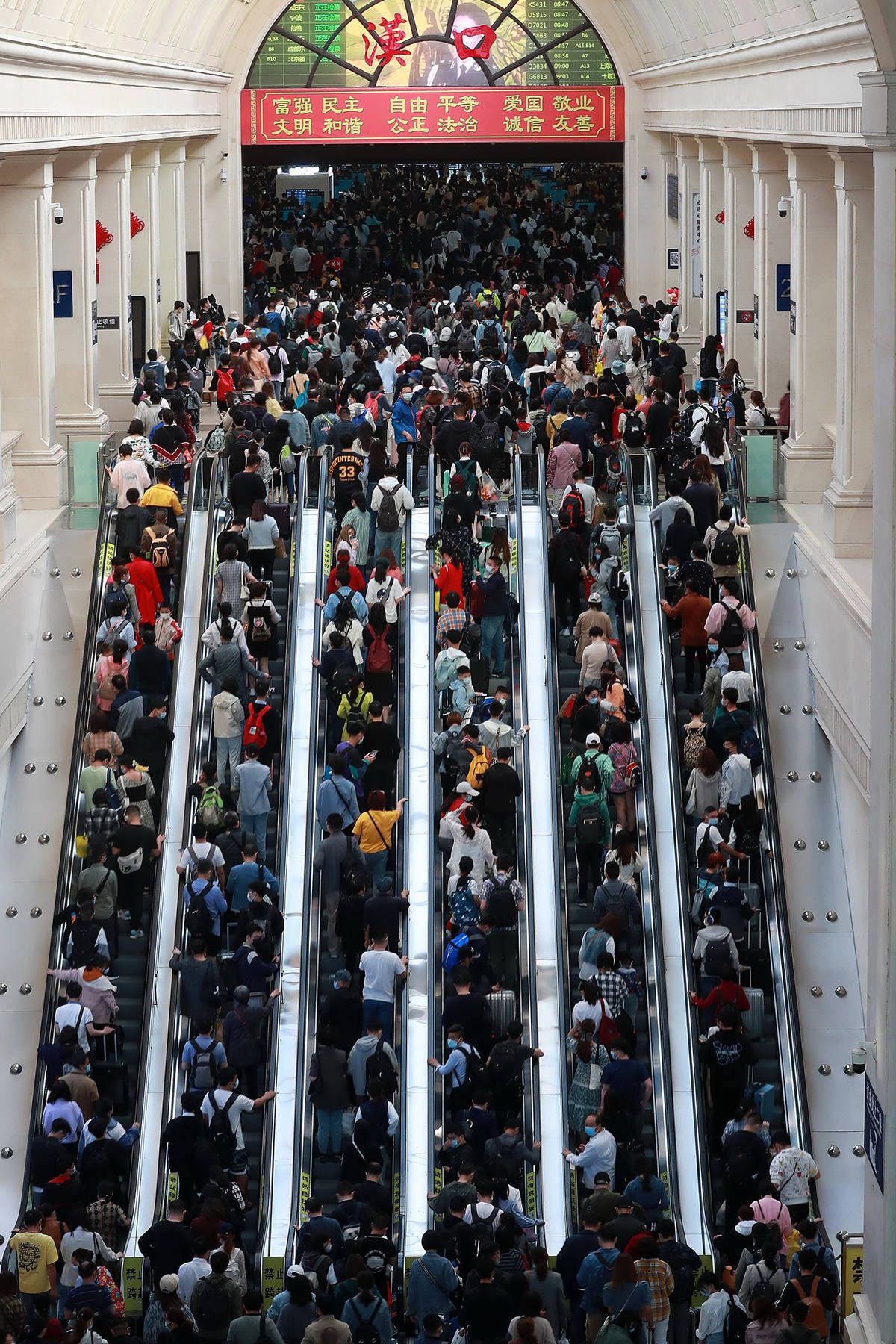 2021年5月1日,武汉,旅客在汉口火车站有序进站乘车。