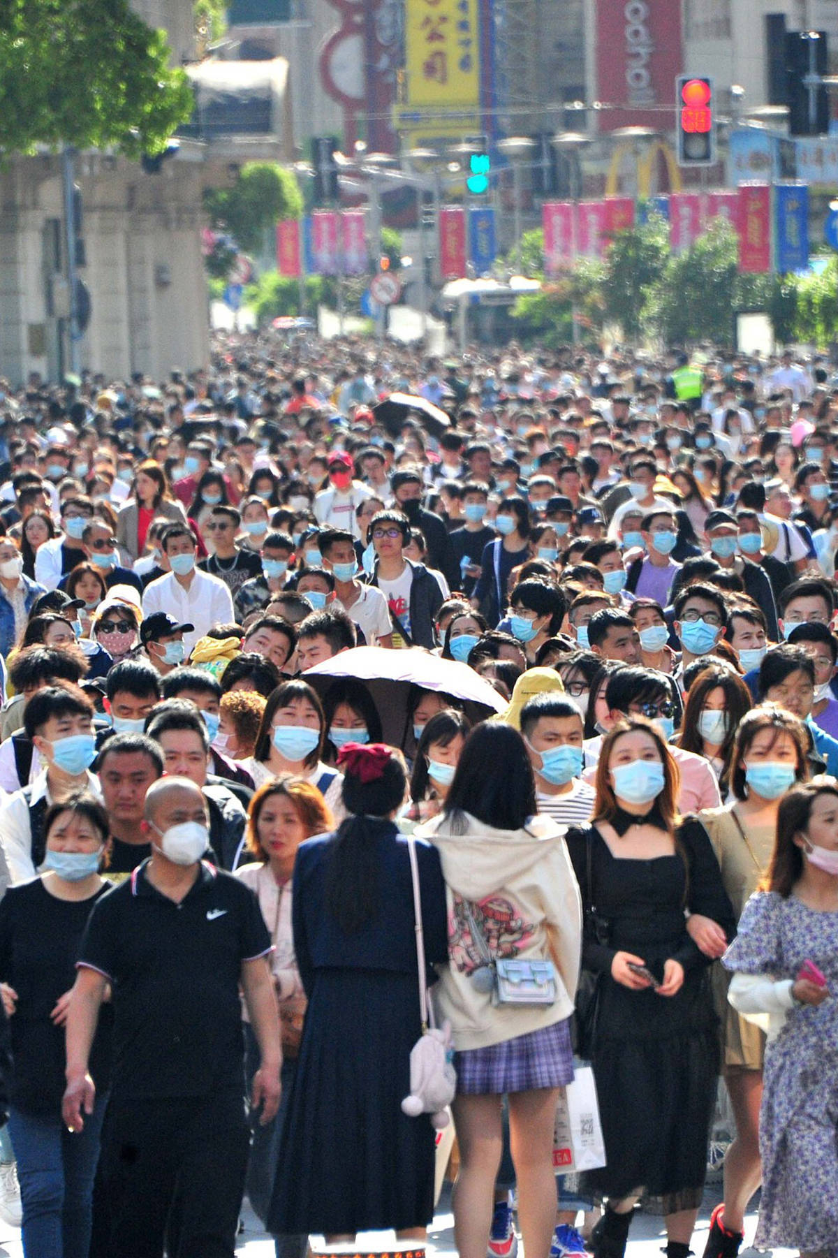 2021年5月2日,上海,游客在南京东路休闲游玩。
