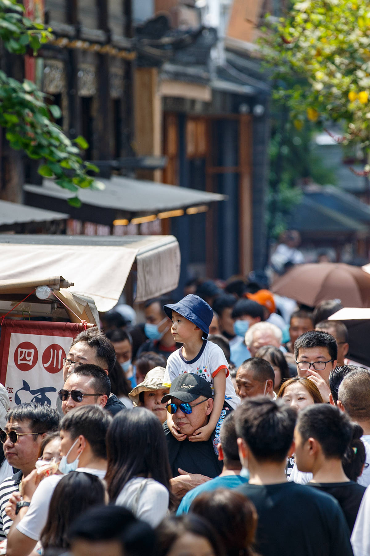 2021年5月1日,成都,宽窄巷子特色街区内,游客人山人海。