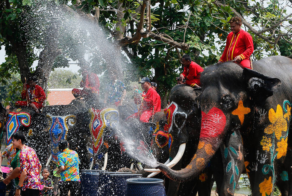 当地时间2023年4月11日,泰国曼谷北部大城府,大象向人们泼水庆祝泼水节。该活动的举办是为了促进泰国的旅游业。