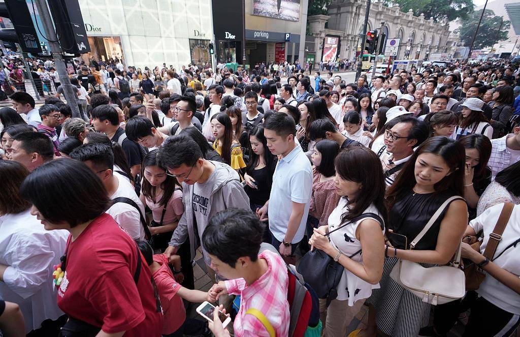 2019年“五一黄金周”期间,香港尖沙咀广东道上品牌店林立,大批游客前来购物。