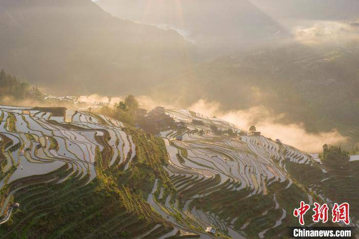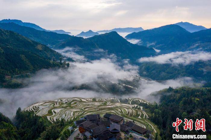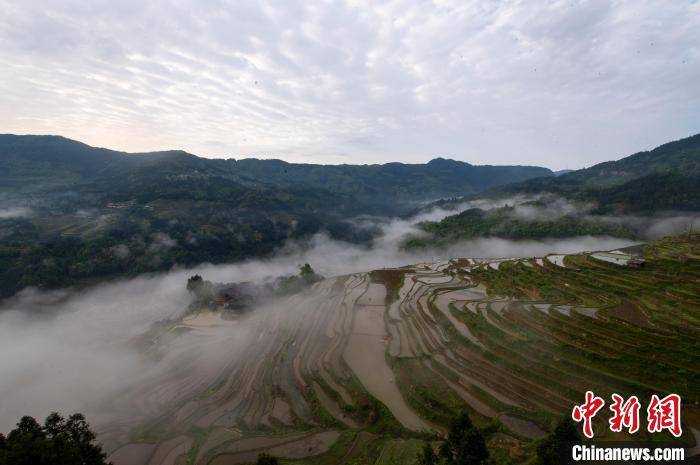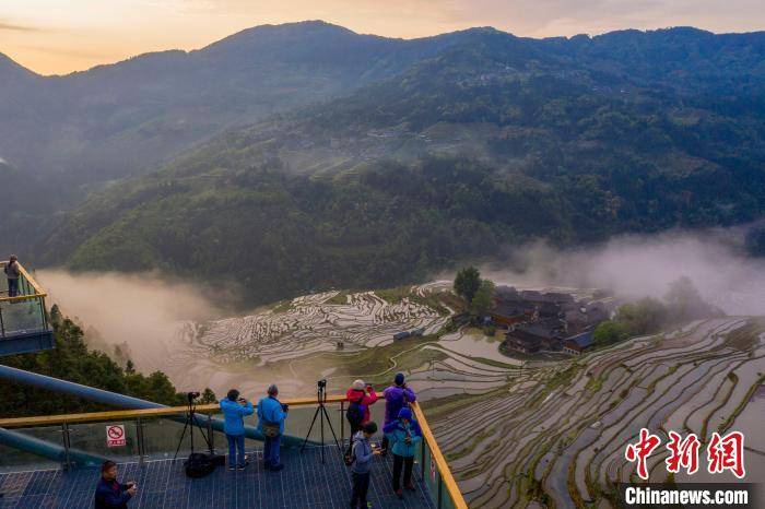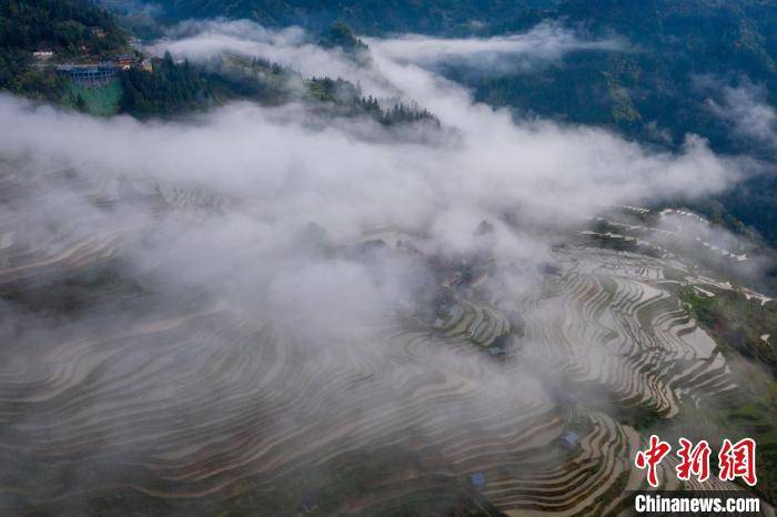 暮春时节,贵州省黔东南苗族侗族自治州从江县加榜梯田景区水满田畴,云雾缭绕,梯田、苗寨在云雾中若隐若现,宛如人间仙境,吸引众多游客前来观光拍照。