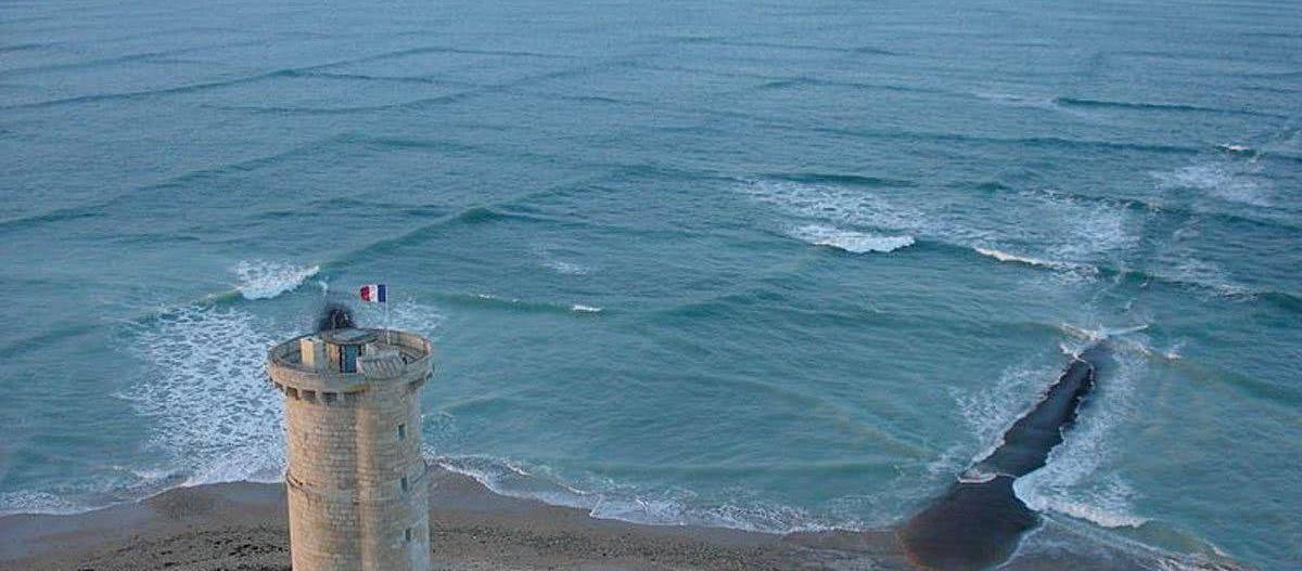 在法国的瑞尔岛(Isle of Rhe)就出现了这种罕见的方形波浪。这种方形波浪的现象有一个名字叫“十字海”(Cross sea),它们在海面出现时呈现出方形和网格状,像一个巨大的围棋棋盘平铺在海上。这种奇特的自然景观在海滩上是很难看到的,需要在一定的高度之上才能领略大自然的鬼斧神工,所以来自全球各地的游客竞相登上瑞尔岛上的灯塔,见证这诡异的自然奇观。