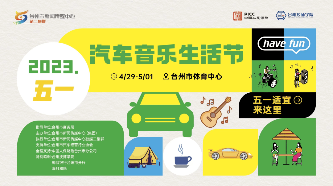 4月29日-5月1日,台州市体育中心,现场有热门燃油车、新能源车、非遗文创、网红美食、创意手工、时尚花艺、亲子互动、潮玩打卡,现场购车买房,下单即可抽奖。惊喜盲盒区全天候0门槛抽奖。初夏主题音乐会,连续3晚,主播唱给你听!