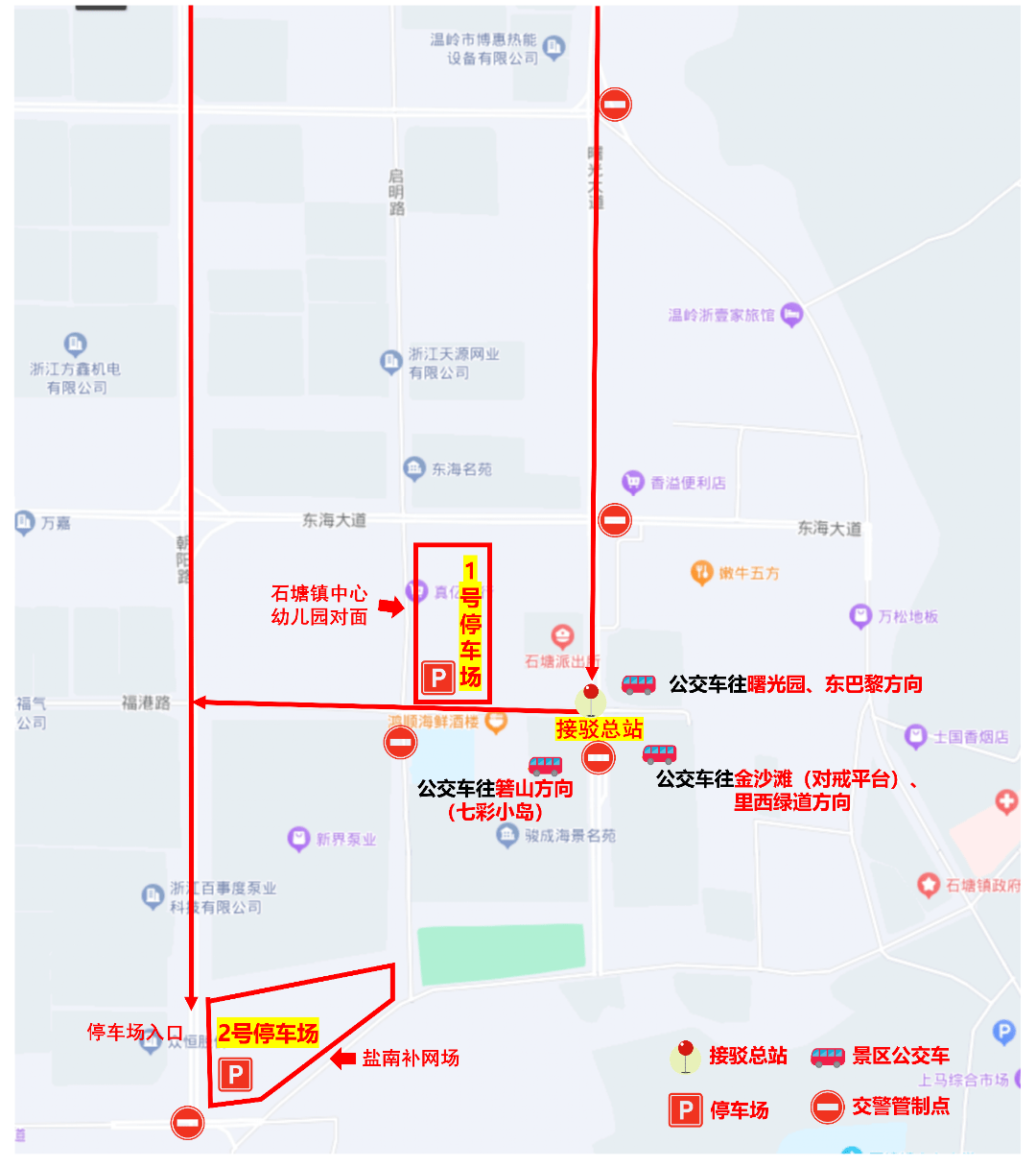 一、除石塘镇内车辆(凭行驶证)、旅游大巴(可前往曙光园、绿道、金沙滩方向)、公交车、假日行政管理车辆及应急等特殊车辆外,其他车辆一律停放在上马工业园区临时停车场内,换乘前往曙光园、东巴黎、金沙滩、绿道珍珠滩、对戒观景平台(尖山头)、箬山七彩小岛等方向的公交巴士。换乘往返景区公交免费。