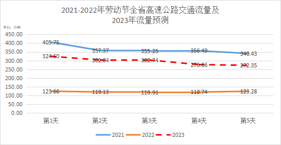 预计2023年劳动节全省高速公路交通流量将呈现前高后低“流量均衡”态势,节假日第一天为出行高峰,随后交通流量略有下降。假期五天,预计全省高速公路交通流量约为1478.98万辆,日均295.80万辆,是平日流量的1.62倍,较2022年劳动节增长145.79%。