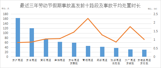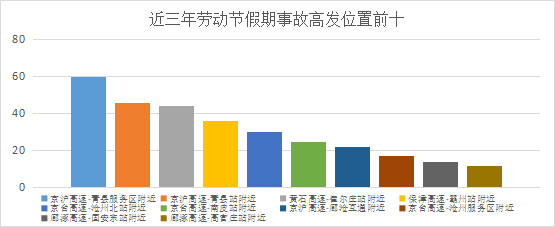 最近三年劳动节期间,事故高发位置排名靠前的有:京沪高速青县服务区附近、京沪高速青县站附近、黄石高速崔尔庄站附近、保津高速霸州站附近、京台高速沧州北站附近、京台高速南皮站附近、京沪高速廊沧互通附近、京台高速沧州服务区附近、廊涿高速固安东站附近、廊涿高速高官庄站附近等,平均事故处理时长均超过30分钟。
