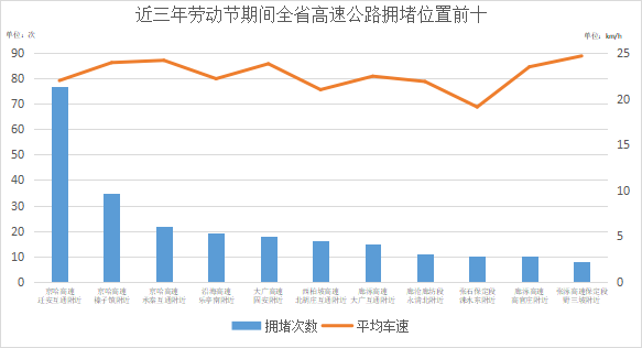 近三年劳动节期间,全省高速公路易拥堵位置前十名统计如下图: