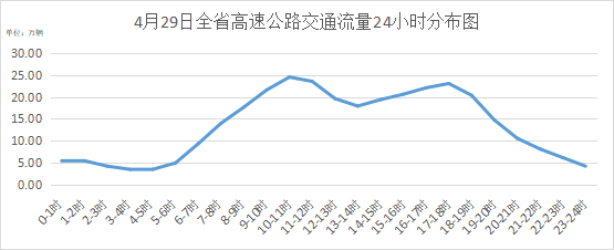节日期间流量高峰预计出现在4月29日(节日第一天),当天全省高速公路收费站出口流量预计达到324.60万辆,是平日出口流量的1.78倍。从时段分布看,车流量呈“M”型分布,上下午各形成一个车流高峰,分别在上午9:00至12:00之间(通常11:00左右达到峰值)和下午15:00至17:00之间(通常16:00左右达到峰值),12:00至14:00之间车流量有显著回落(通常在13:00左右达到谷底值)。