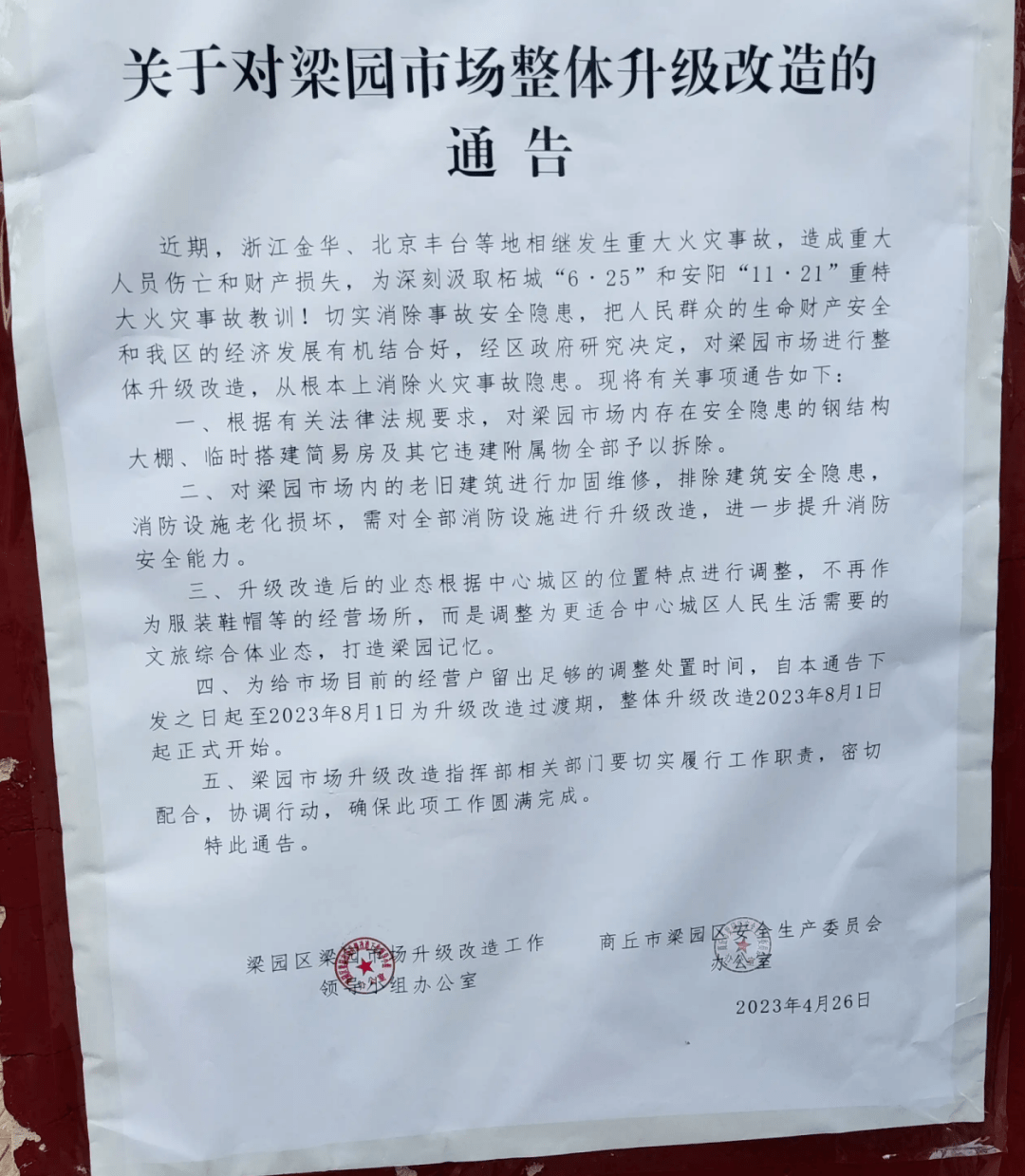 4月26日,梁园区梁园市场升级改造工作领导小组办公室和梁园区安全生产委员会办公室已经联合发布关于对梁园市场整体升级改造的通告。