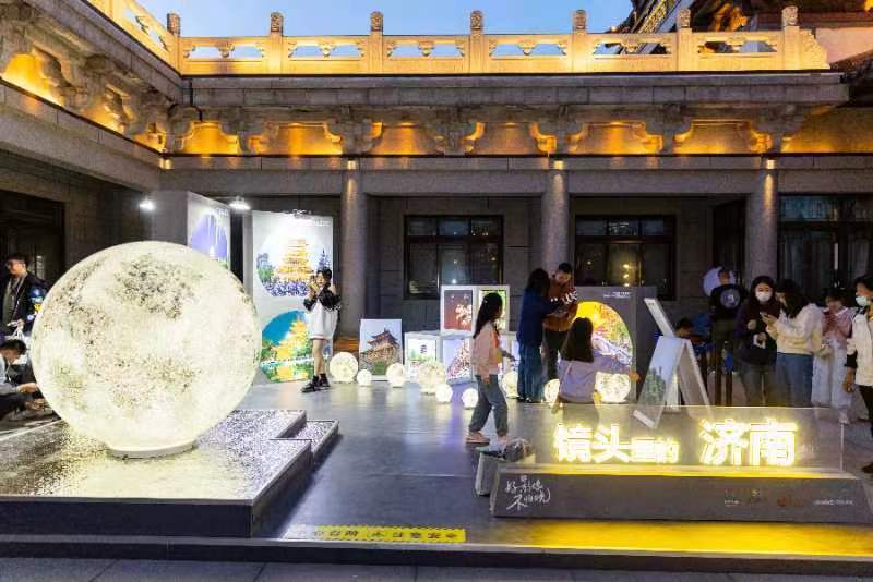 在超然楼二层广场北侧的月亮展区,矗立着一轮“超级圆月”网红打卡装置,此“月映超然楼”月球灯在夜晚发出暖黄色柔和的光亮,与金色高耸的超然楼相映成趣,圆月旁排布着镶有20张济南夜景的照片灯箱,记录泉城夜色柔美迷人瞬间。在超然楼二层广场南侧的巨幅影展展区,布置有6组共12张不同角度展现泉城夕阳景色的摄影作品,无论是大明湖古桥夕照、余晖斑斓的烂漫惬意,还是济南东部新区夕阳妆点城市高楼的壮美,皆尽收眼底。超然楼内三层走廊的自然人文单元影展,以”薄物秋毫“”去自然里“”济水之南泉水之韵“”古城正青春“四个主题板块,展出40张表现济南风貌的摄影作品,游客可细细观赏,体味四季变换中的泉城魅力。