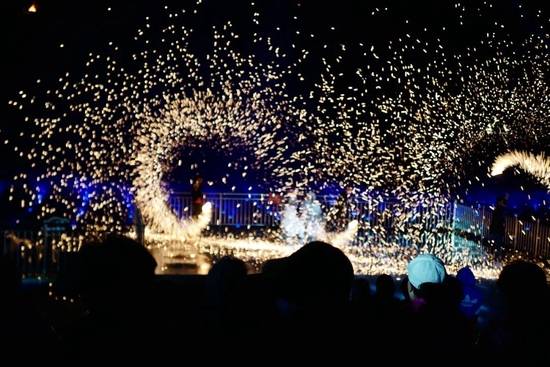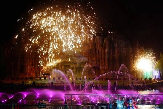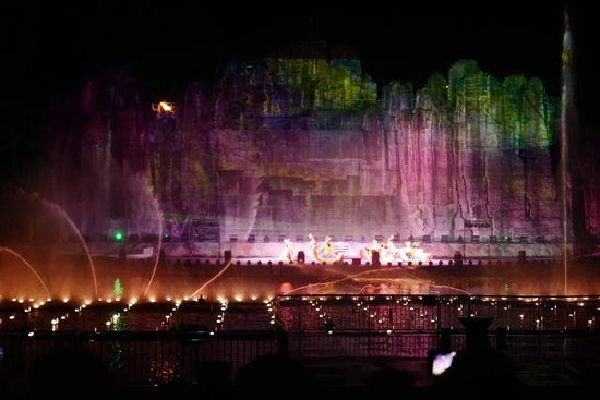 当夜幕降临、华灯初上之际,一座坐落于夏津黄河故道森林公园内、夏津德百温泉度假村南侧的国家4A级德百旅游小镇,这里在夜色中焕发着古典淡雅的光芒,在荧幕开阔前的湖面上,立体灯光随着震撼的音乐摇动,或灵动或悠扬,或激昂或舒缓。夏津德百旅游小镇大看台表演的《铁魂火花之椹仙情》让微博大V和游客们流连忘返。
