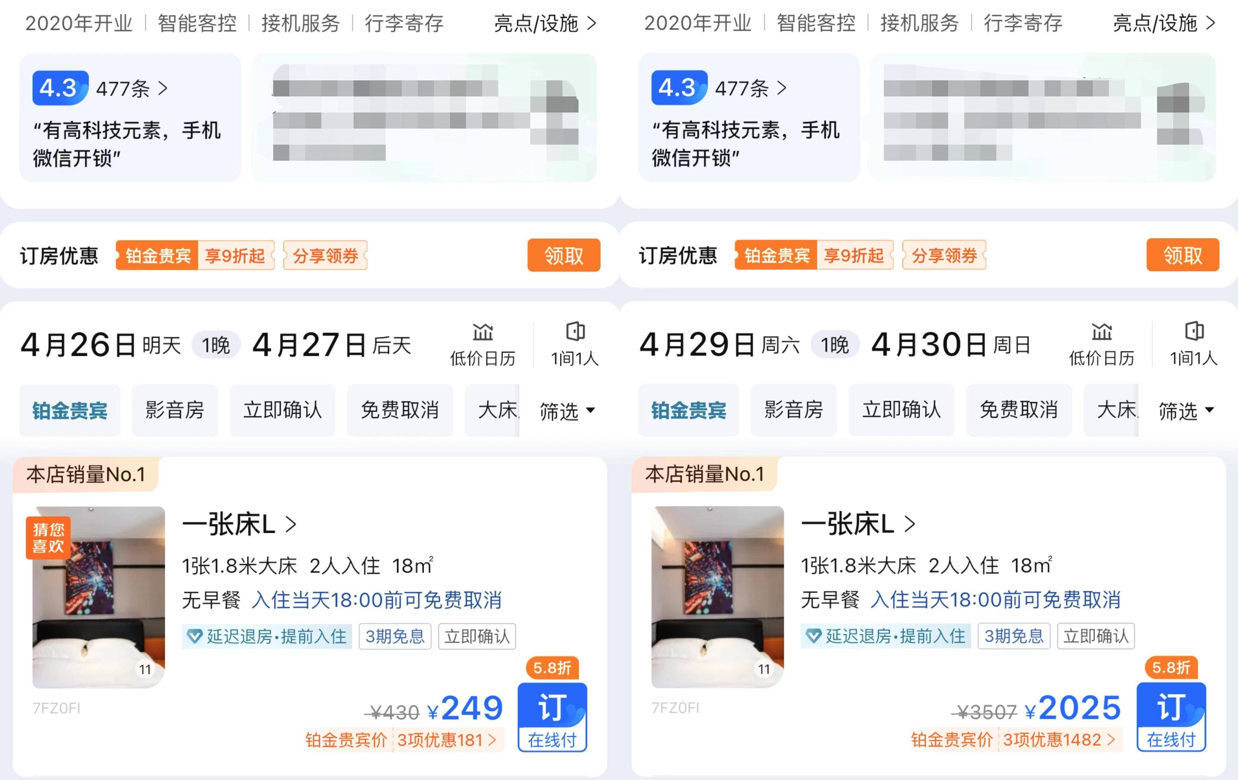 西安热门旅游景区大雁塔旁的一家精品酒店,18平方米的大床房平日价249元,4月29日、4月30日和5月1日入住的价格均高达2025元,几乎在平日价后面直接加了个零。有受访者表示,四位数住这样的酒店,实在无法接受。专家建议,节假日酒店房价上涨虽然受市场供需影响,但也需要考虑涨价幅度的合理性,剧烈的酒店价格波动不利于维护市场的良好秩序。