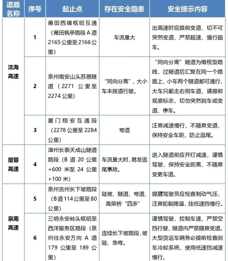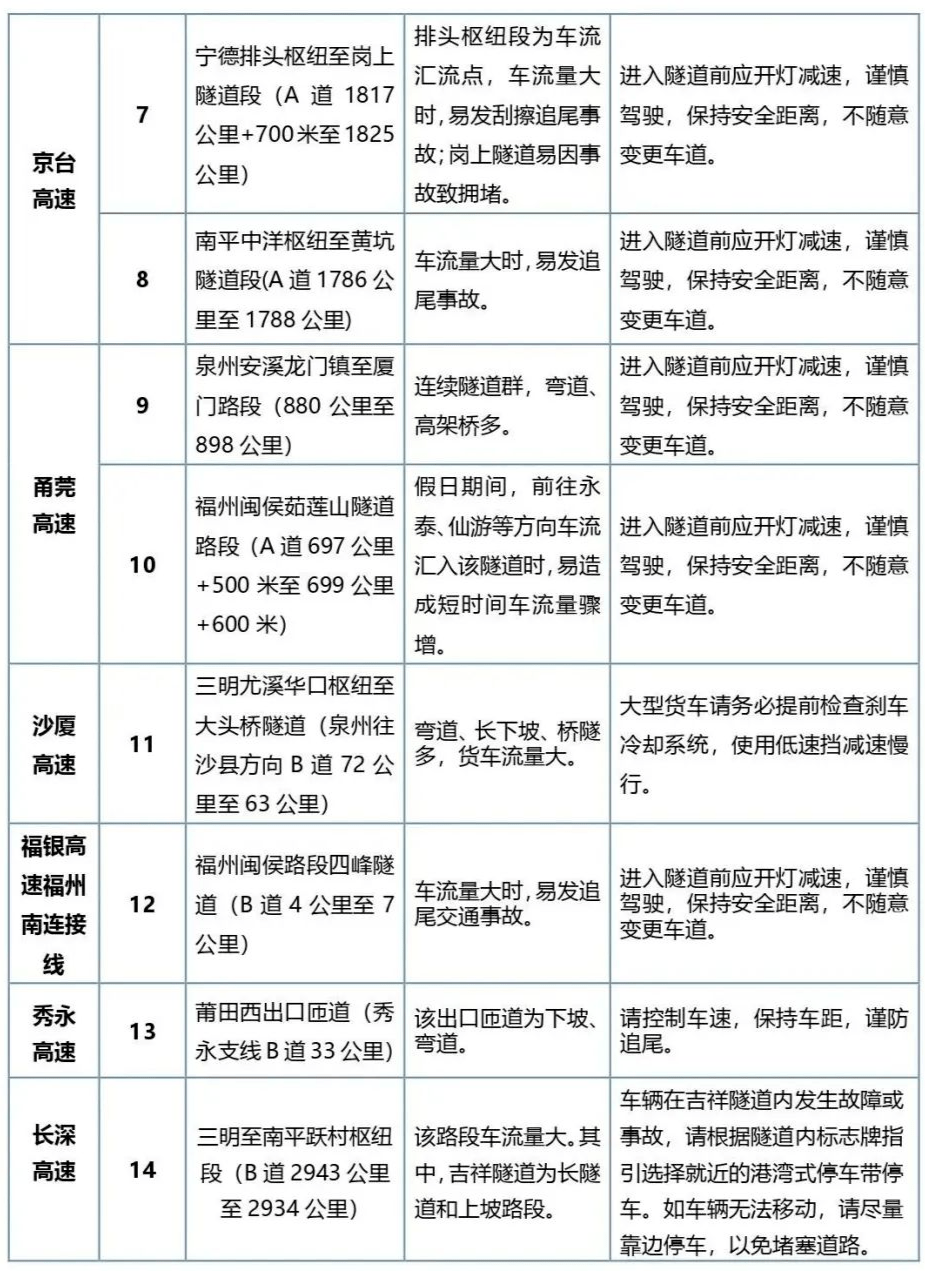 近三年易发事故隧道8处:京台高速牛岩山隧道(福州往古田方向)、沈海高速大坪山隧道、泉南高速龙阁岭隧道(泉州往三明方向)、沙厦高速龙门岭隧道(厦门往安溪方向)、厦蓉高速天成山隧道(漳州往厦门方向)、泉南高速西洋隧道、福银高速雪峰山隧道、京台高速黄竹山隧道(福州往古田方向)。