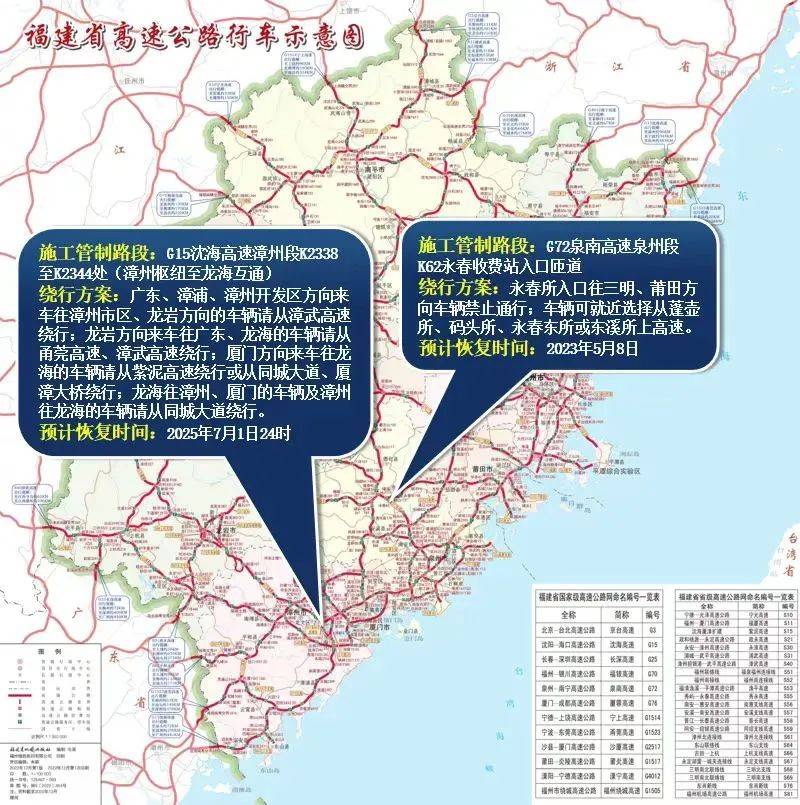 沈海主线西溪大桥(漳州往龙海、东山方向)因施工重建双向封闭无法通行,提醒提前规划行程,避开施工封闭路段。