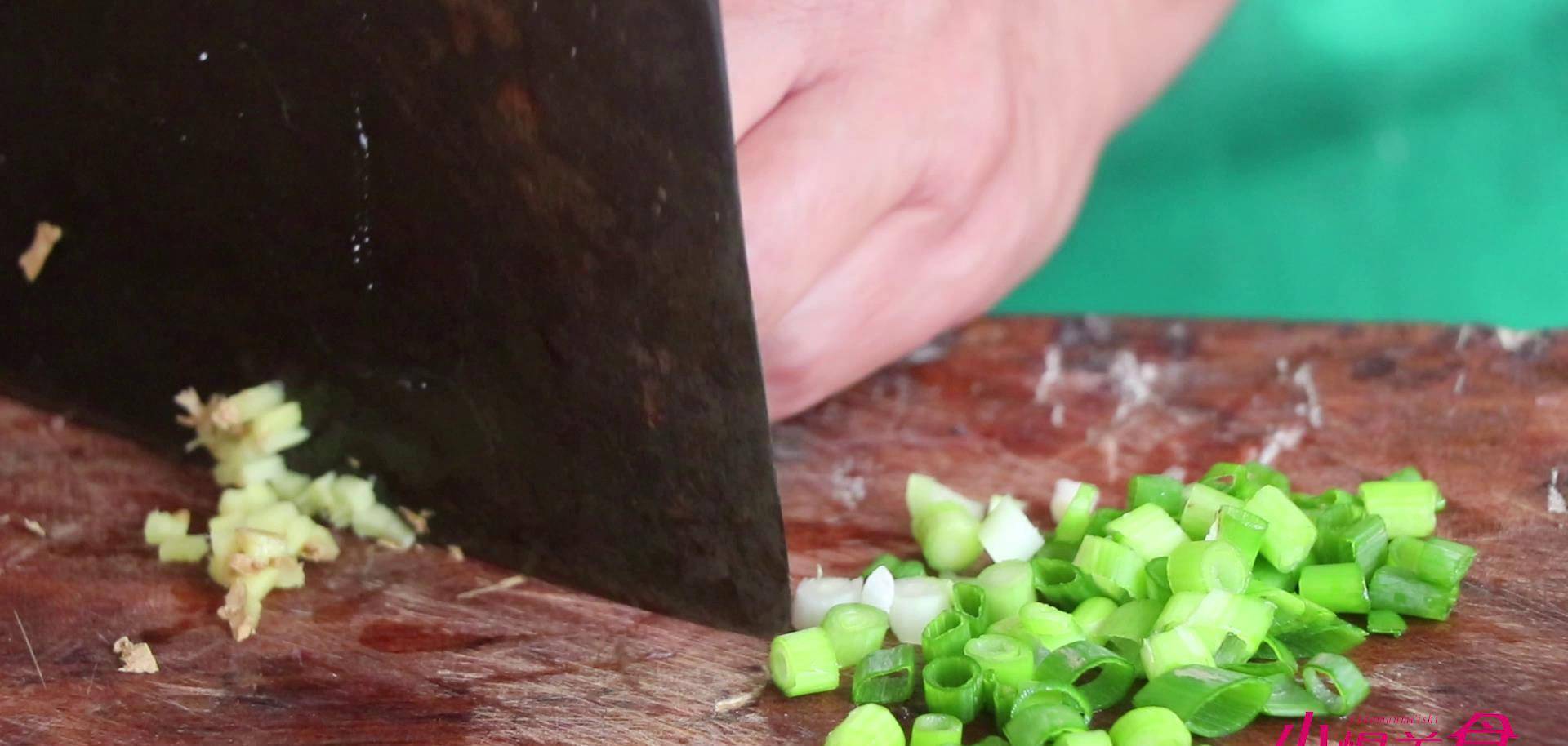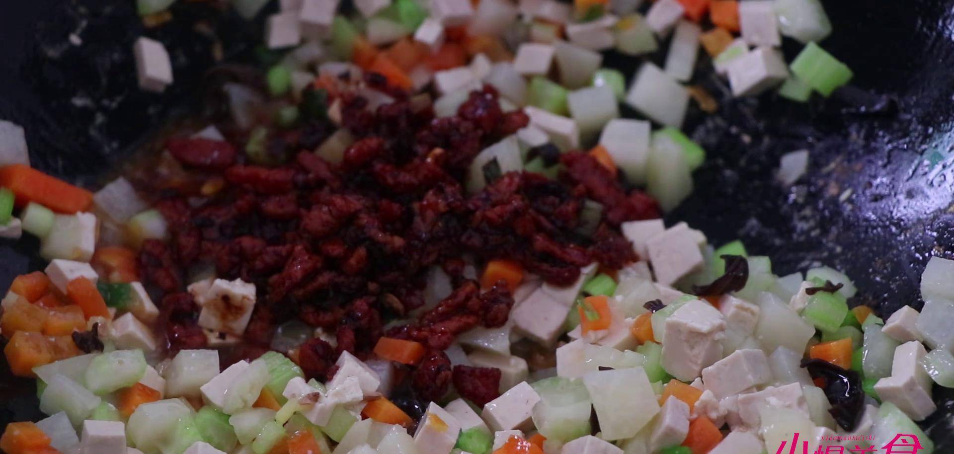 在锅中再倒入少量的食用油,放入另外一半儿的葱姜末,再放入我们切好的丁,炒匀之后放入刚刚炒好的肉馅儿。翻炒一下,加入一勺食用盐,加入适量的清水。开小火炖上三分钟。时间到我们关火。出锅成盘。
