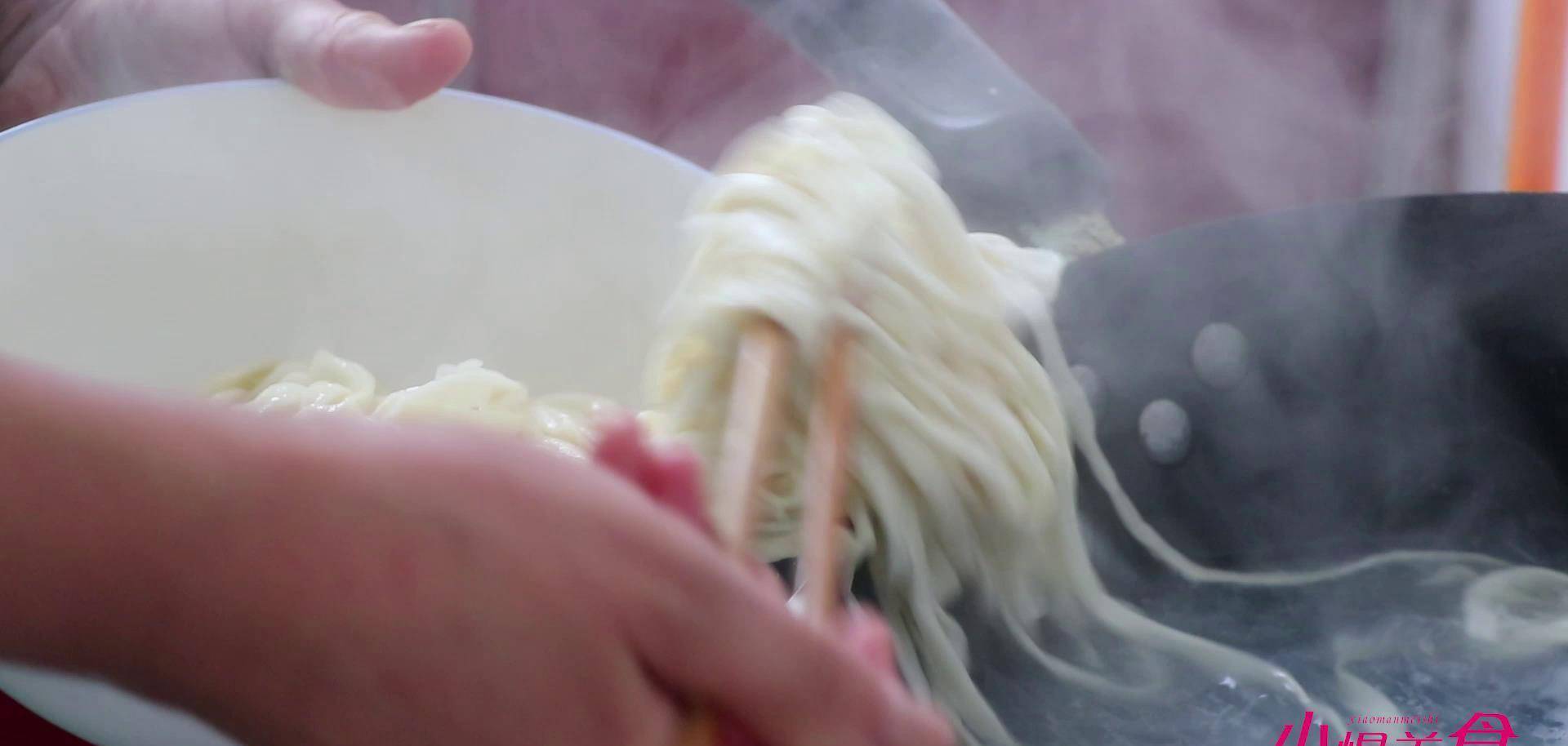 接着起锅烧水,下入我们提前准备好的面条,煮熟后捞出,加上一勺我们刚刚炒好的哨子,再撒上一点韭菜末儿,搅拌均匀就可以开吃了。
