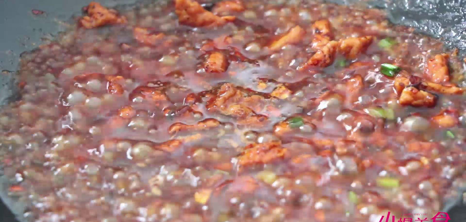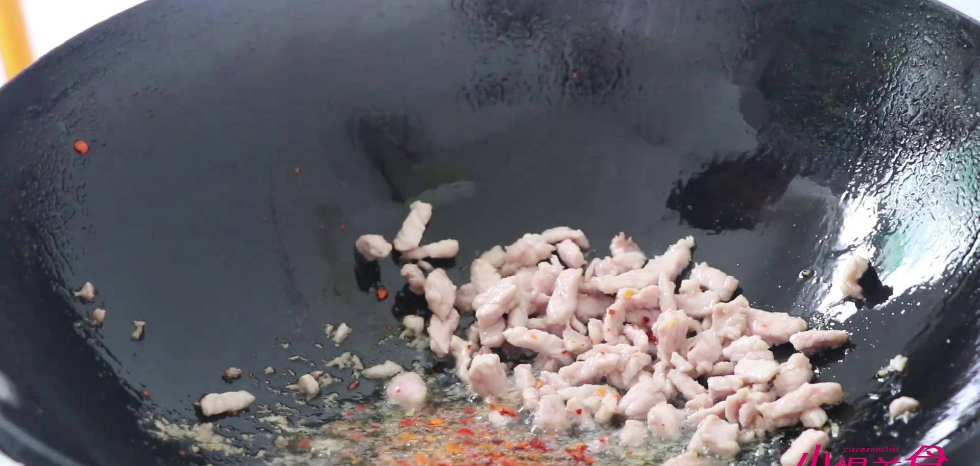锅中放油放入肉馅儿,炒至变色,猪肉炒出油之后呢,我们把肉推到一边。加入一些辣椒面,炒出红油。加入一些胡椒粉,放入一半的葱姜末。整体翻炒均匀。加入一些料酒,加入一些酱油,放上多一点的醋,翻炒均匀出锅盛盘备用。