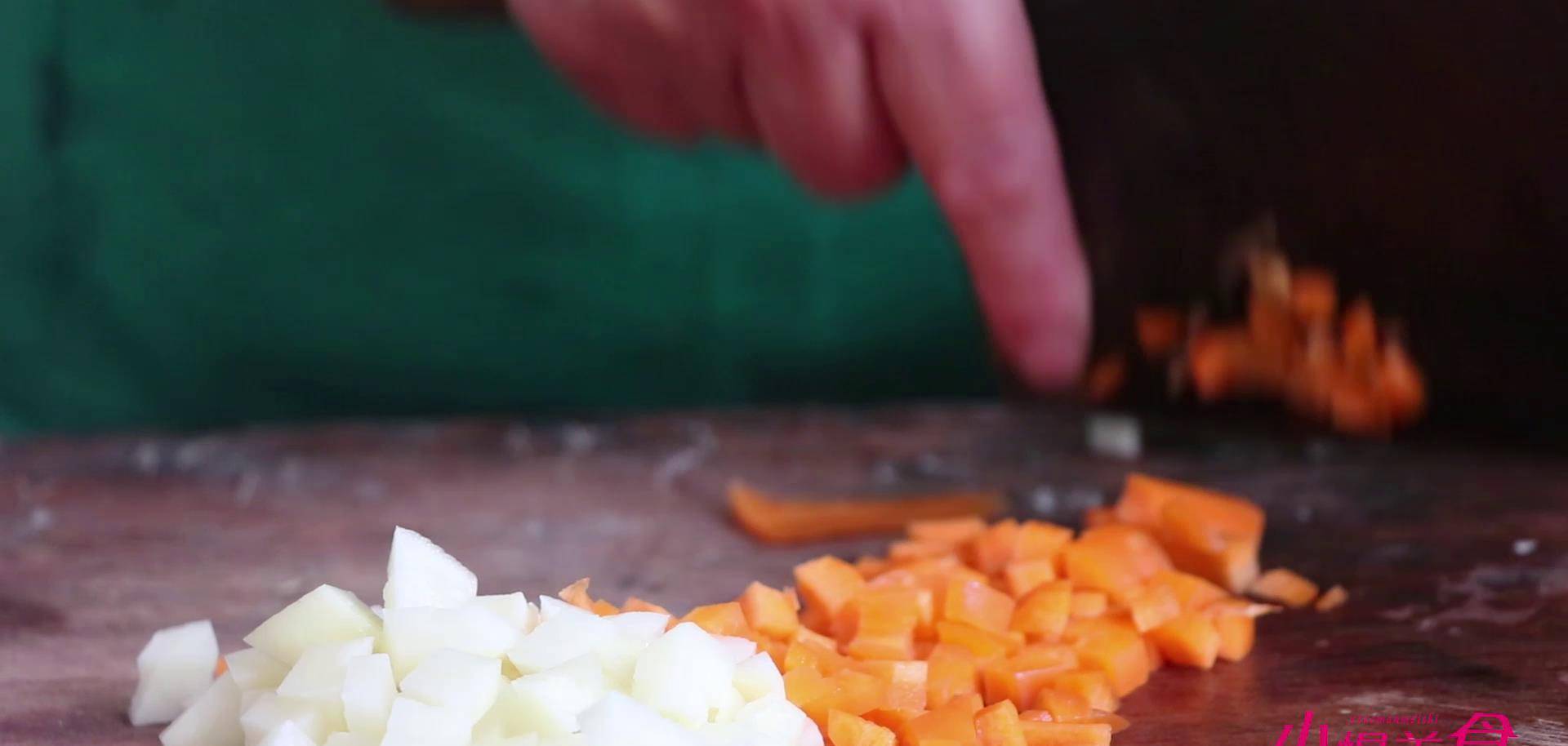 第1步就是处理食材,我们把土豆西芹,胡萝卜,豆腐,肉,木耳都切成丁。再切上一些姜末,切上一些葱花备用。